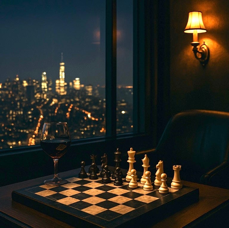 The penthouse is silent, save for the soft hum of a low, throaty saxophone, curling like cigarette smoke from the speakers into the air. Beyond the floor-to-ceiling windows, the city gleams in a sea of gold and crimsonâlights stretching for miles, indifferent to the game unfolding within these walls.